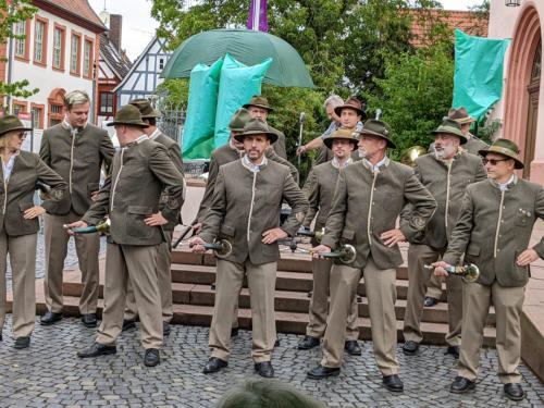 Umstädter Bauernmarkt Traditionell eröffnet der Umstädter Bürgermeister und unser Bläsercorps den Umstädter Bauernmarkt - das letzte mal 2019 vor Corona.Dieses Jahr 2022 haben wir wieder sehr gerne der Einladung zugesagt und werden die Eröffnung mit jagdlichen Klängen begleiten.Nach der Eröffnung besteht die Möglichkeit, in ungezwungender Atmosphäre mit den Bläsern ins Gespräch zu gehen und auch einmal selbst in ein - natürlich desinfiziertes - Jagdhorn zu blasen.