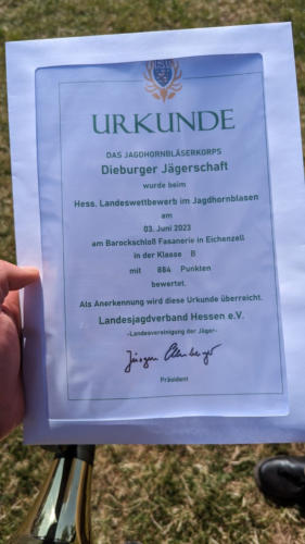 Landeswettbewerb Hessen im Jagdhornblasen, 03. Juni 2023 Unser Bläsercorps hat mit 884 Punkten den 2. Platz in Gruppe B errungen beim Landeswettbewerb in Eichenzell bei Fulda.